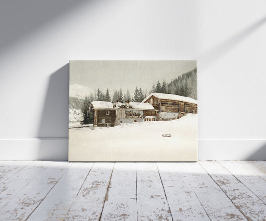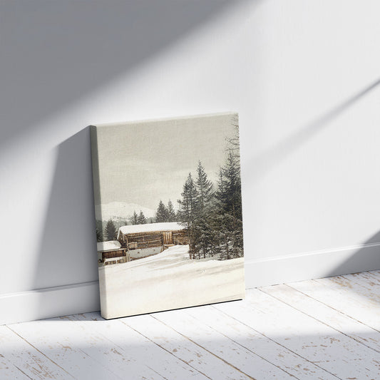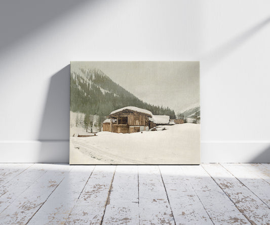 Winter scene with log structure, Grisons, Switzerland