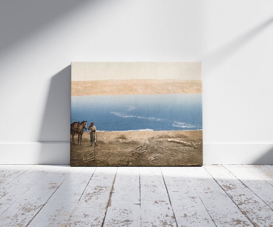 Man with horse standing near the Dead Sea