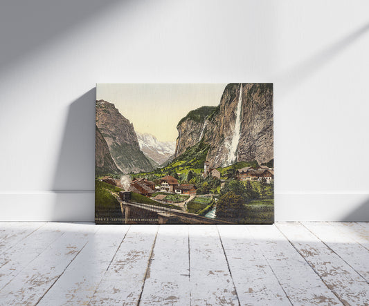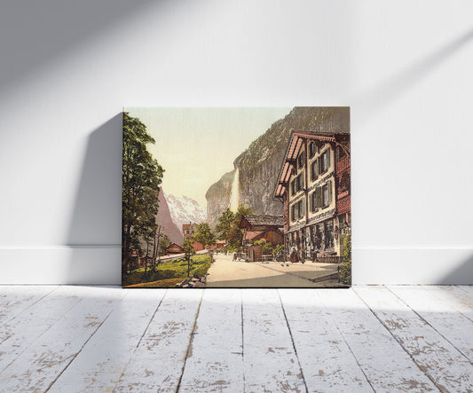 Lauterbrunnen Valley, street view with Staubbach Waterfall, Bernese Oberland, Switzerland
