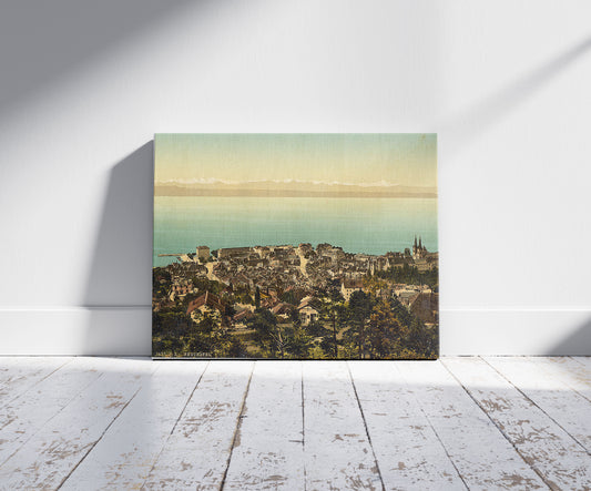 The town, general view showing the alps, Neuchatel, and the castle, Switzerland