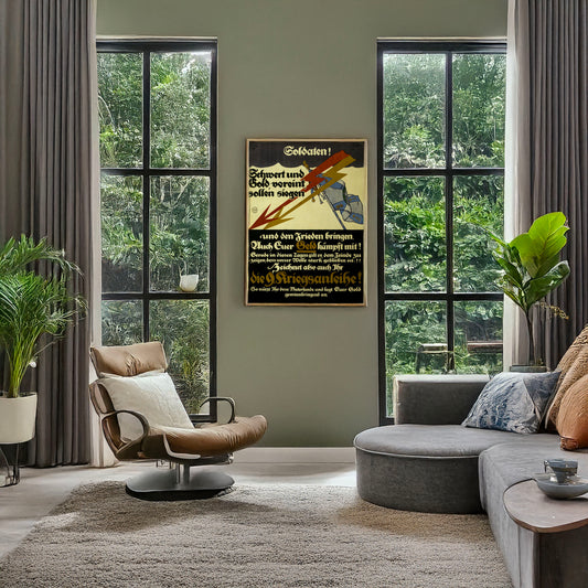Soldaten! Schwert und Gold vereint sollen siegen und den Frieden bringen. Auch Euer Geld kämpft mit! ... Zeichnet also auch Ihr die 9. Kriegsanleihe!