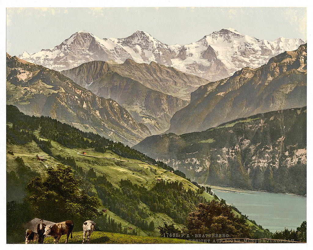 Buy wall art of this image titled: Beatenburg (i.e., Beatenberg), view of Jungfrau, Monch and Eiger, Bernese Oberland, Switzerland, from the Vintage Photochrom Postcards Collection by Second Story Prints. Top quality print reproductions available now!