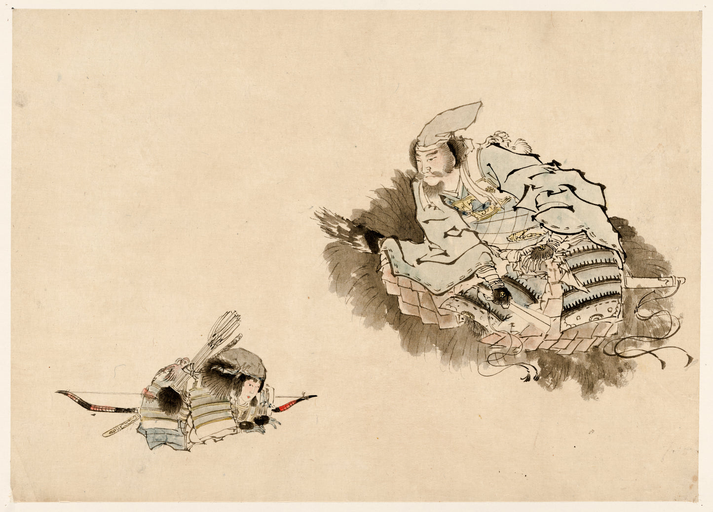 Buy wall art of this image titled: Elder samurai observing a young warrior with bow and arrows, from the Japanese Ukiyo-e and Yokohama-e Prints Collection by Second Story Prints. Top quality print reproductions available now!