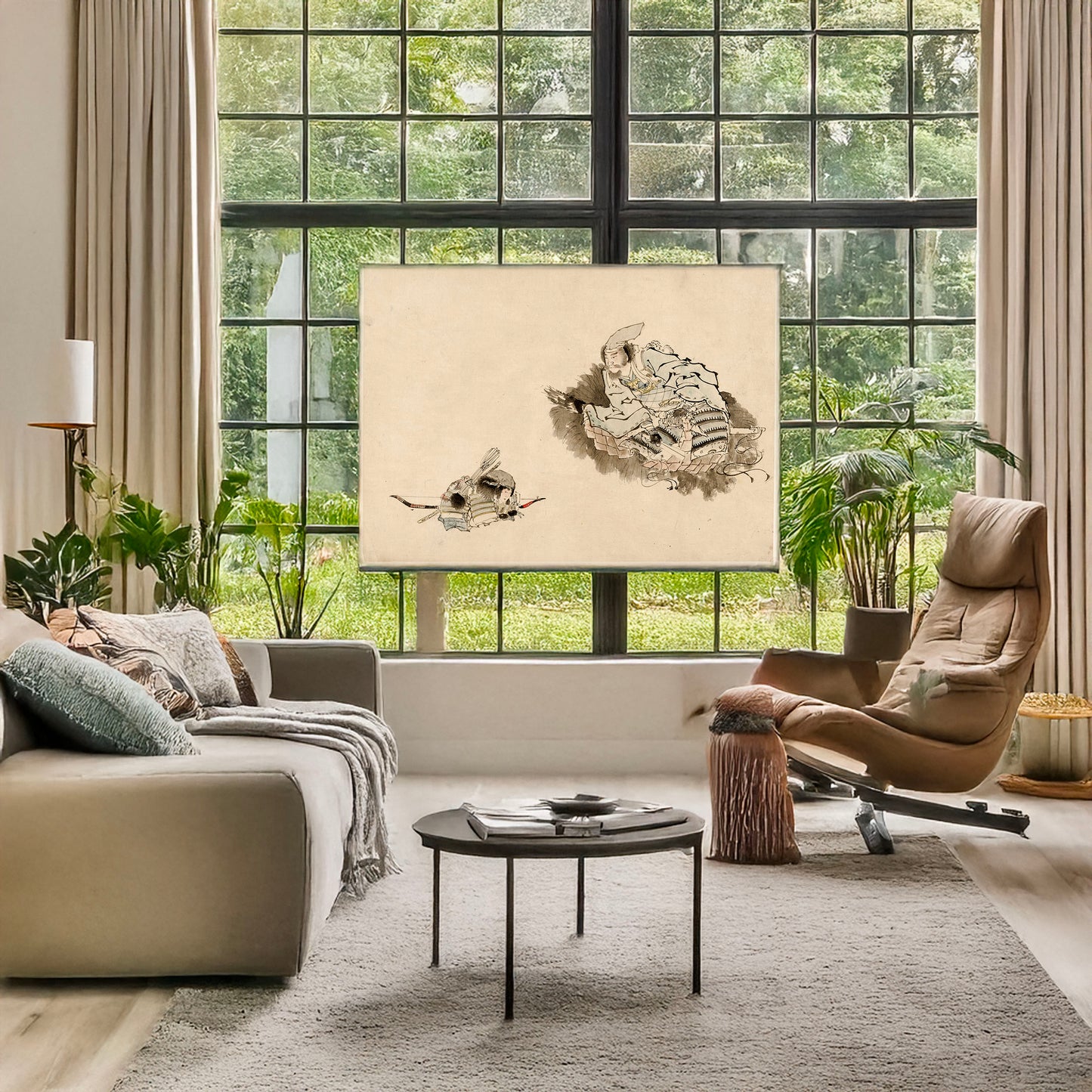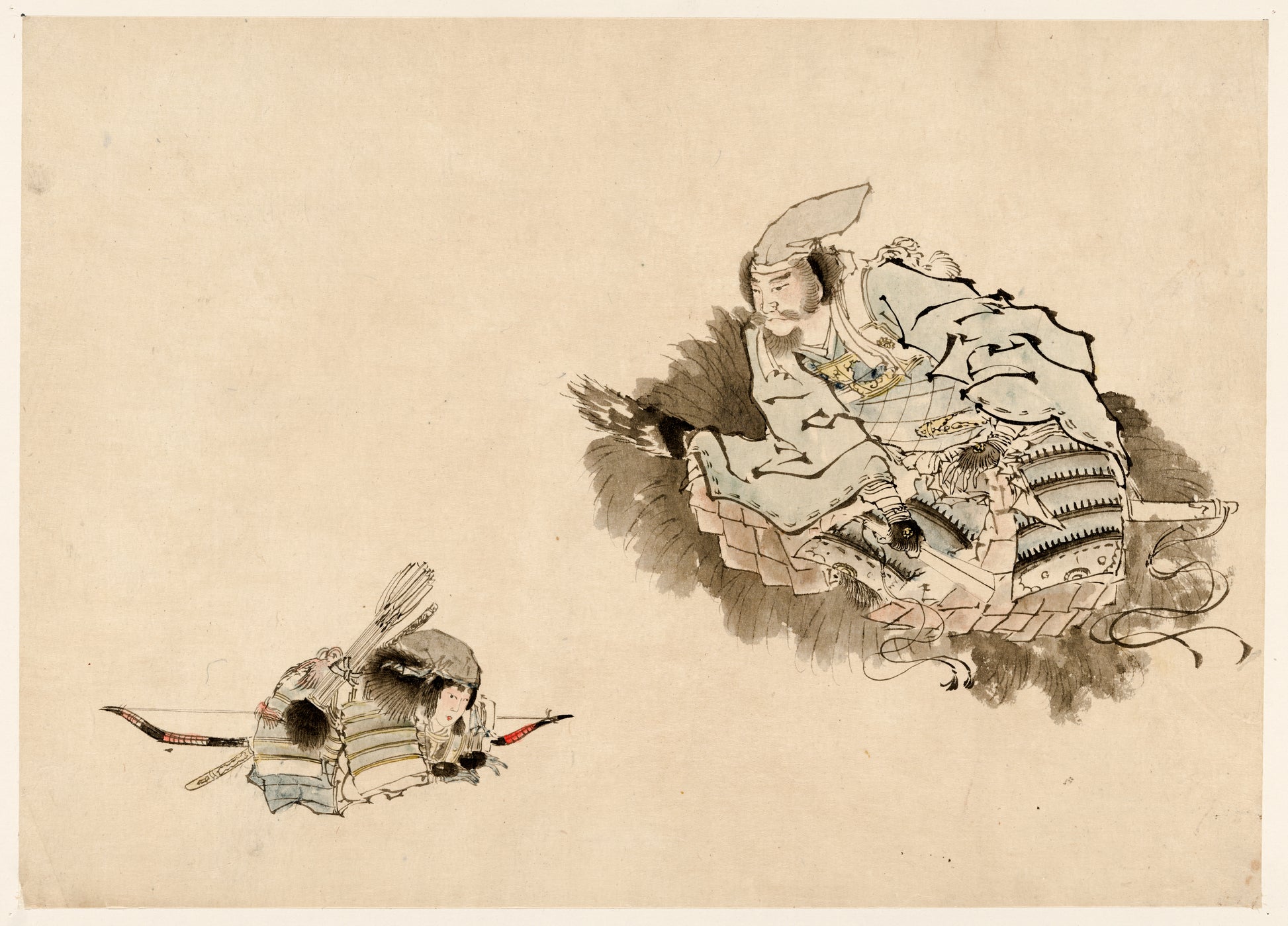 Elder samurai observing a young warrior with bow and arrows