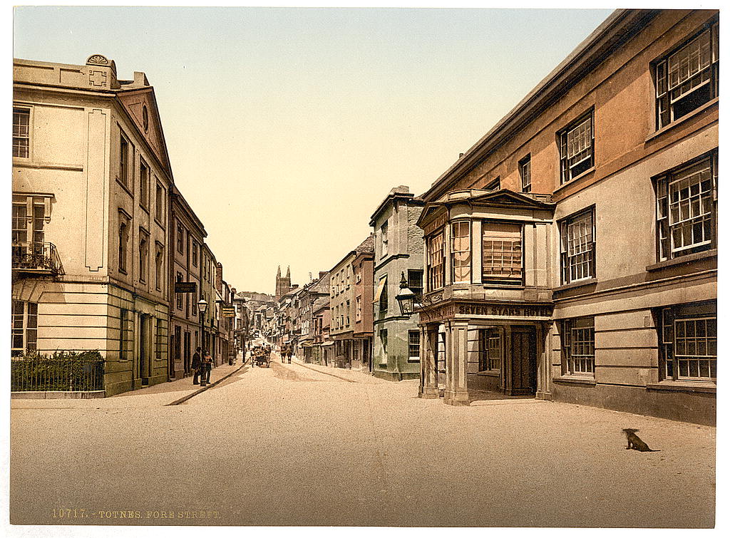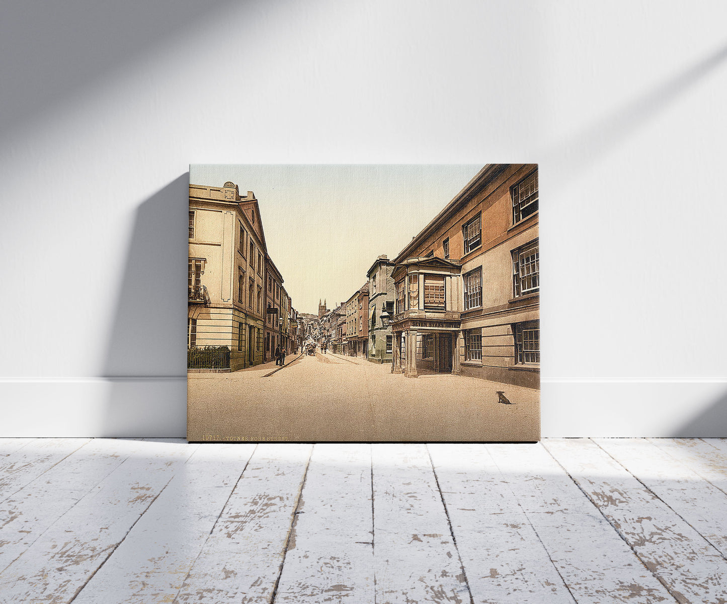 Buy wall art of this image titled: Fore Street, Totnes, England, from the Vintage Photochrom Postcards Collection by Second Story Prints. Top quality print reproductions available now!
