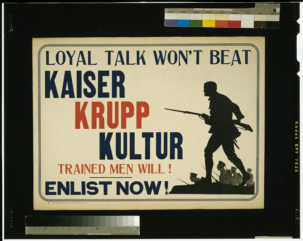 Buy wall art of this image titled: Loyal talk won't beat Kaiser Krupp Kulture, trained men will! Enlist now!, from the World War I Posters Collection by Second Story Prints. Top quality print reproductions available now!