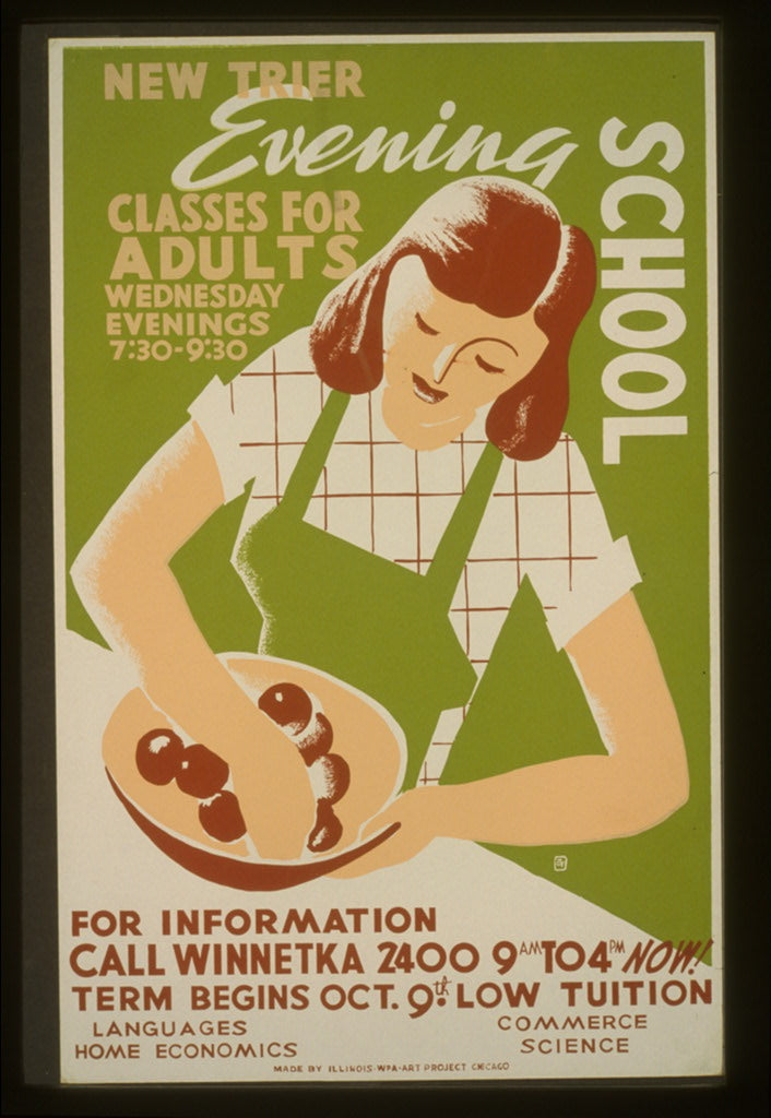 Buy wall art of this image titled: New Trier evening school Classes for adults, Wednesday evenings 7:30 - 9:30., from the WPA Posters Collection by Second Story Prints. Top quality print reproductions available now!