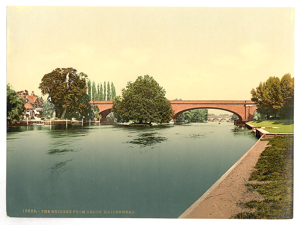 - Title in the Detroit Publishing Co., Catalogue J foreign section, Detroit, Mich. : Detroit Publishing Company, 1905: "The bridge from below Maidenhead, London and suburbs, England."