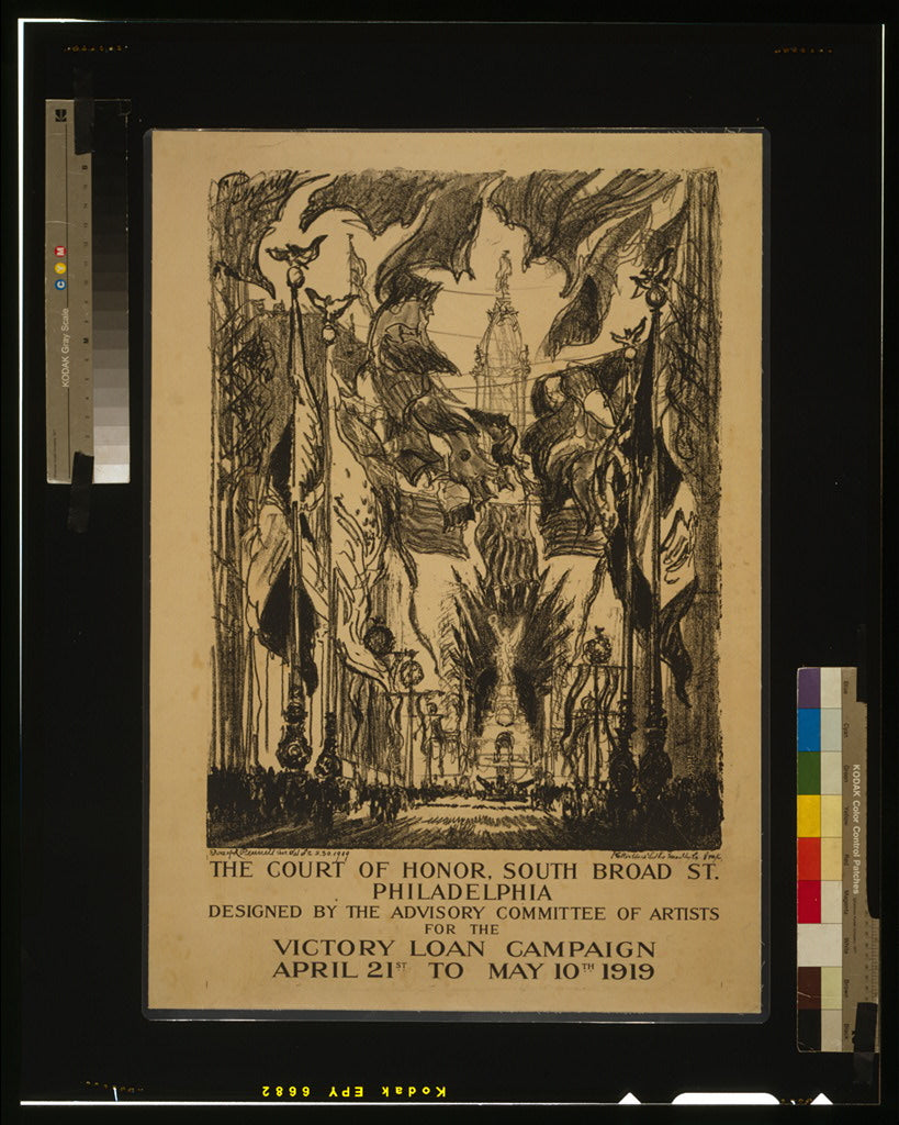 Buy wall art of this image titled: The court of honor, South Broad St., Philadelphia, designed by the Advisory Committee of Artists for the Victory Loan Campaign, April 21st to May 10th 1919, from the World War I Posters Collection by Second Story Prints. Top quality print reproductions available now!