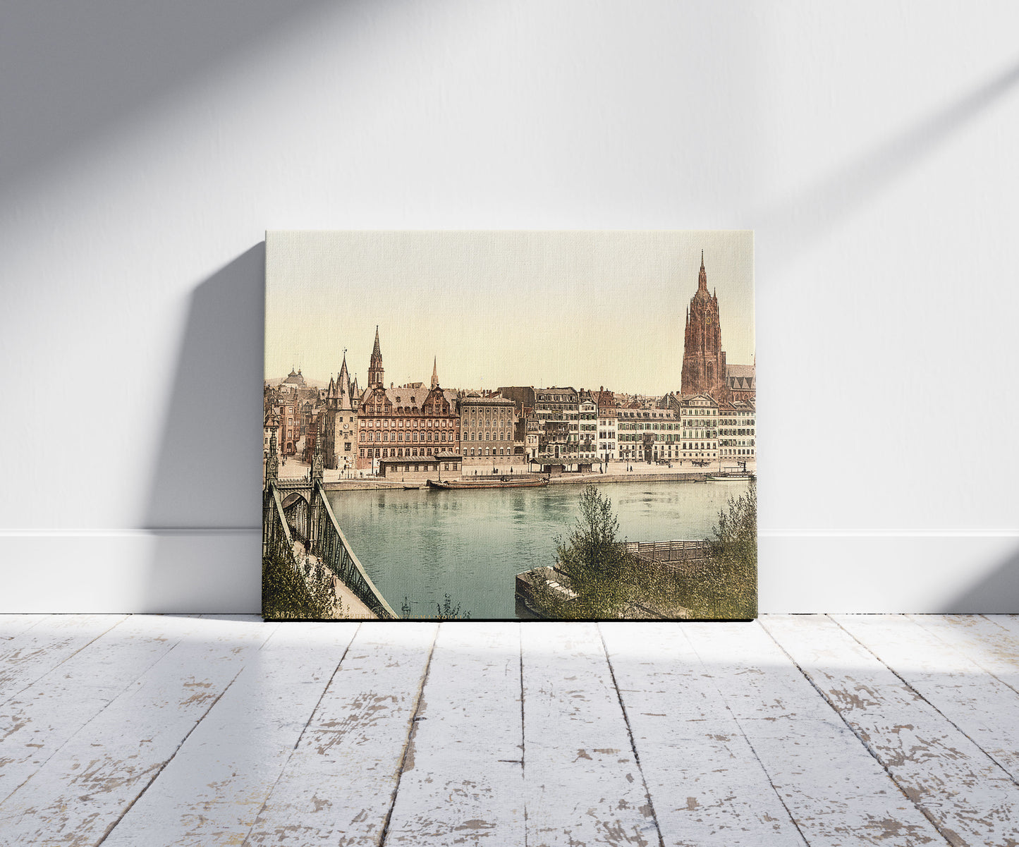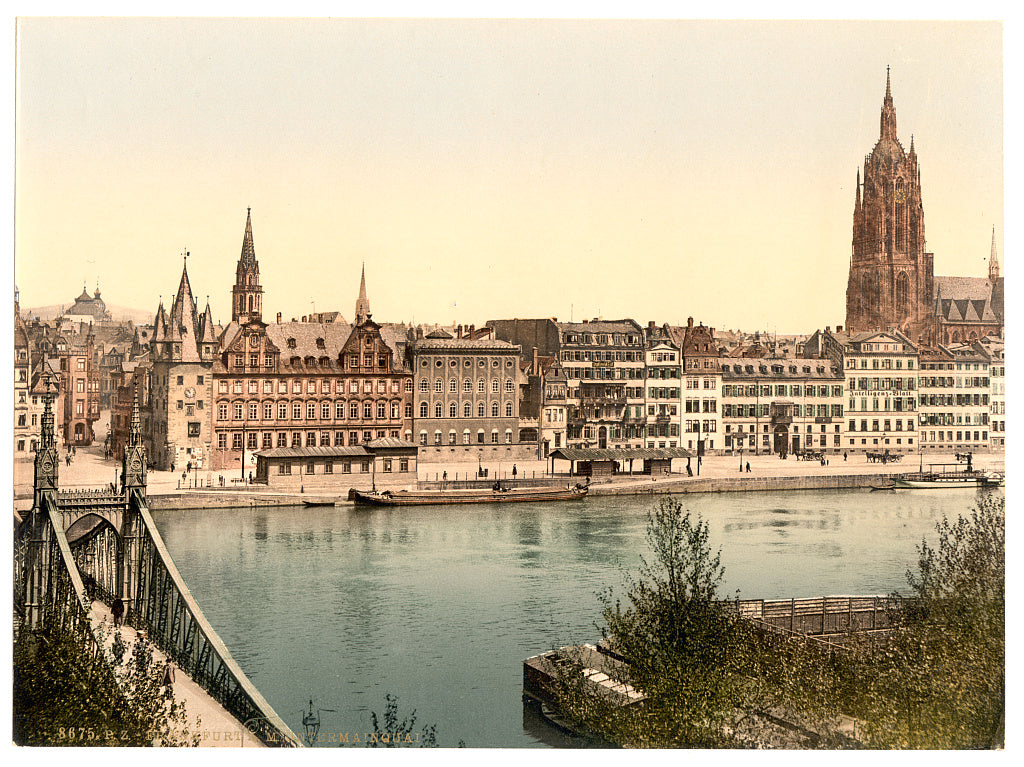 Buy wall art of this image titled: Untermainquai, Saalhof and Cathedral, Frankfort on Main (i.e. Frankfurt am Main), Germany, from the Vintage Photochrom Postcards Collection by Second Story Prints. Top quality print reproductions available now!