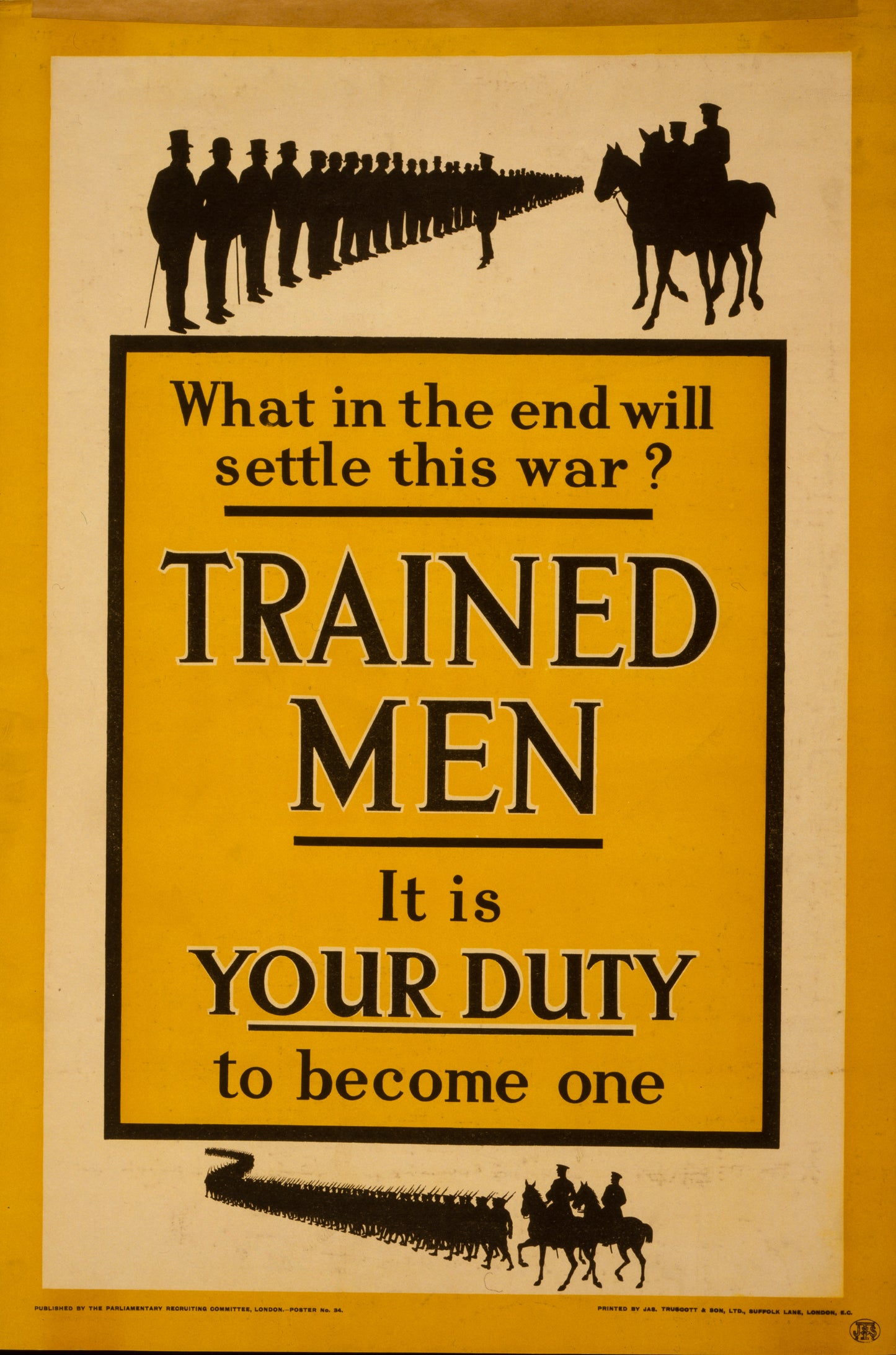 Buy wall art of this image titled: What in the end will settle this war? Trained men. It is your duty to become one, from the World War I Posters Collection by Second Story Prints. Top quality print reproductions available now!